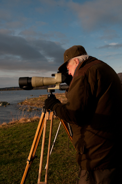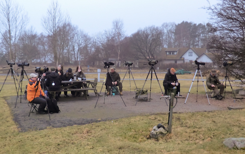 Även våra yngsta besökare togs väl om hand av naturpedagogen Sam Peterson från naturum Vattenriket. Jag tror även att de vuxna besökarna minst lika mycket uppskattade de örnsiluetter som Sam använde för att visa storlek och vingspann på örnarna. Utöver havsörnarna kunde en vacker samling salskrake följas i viken väster om oss. Minst ett möjligt vårtecken visade sig i form av en storspov som kom överflygande och flöjtade för oss. Må det gå den väl detta år så den inte slutar sina dagar i en snödriva som fjolårets storspov här ute gjorde.