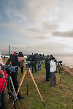 Plötsligt uppenbarade sig en tordmule på vattenspegeln utanför Snickarehaken. Fågeln dök flitigt och var därför inte helt lätt att jobba in i tubkikarna, men efter en del manövrerande fick nog alla åtminstone en skymt av den vinterskrudade alkan som sakta rörde sig ut på bukten. Den oväntade alkobsen värmde inombords. Faktum är att tordmule inte ens ses årligen i Äspet. För flera av deltagarna handlade det därför om en helt ny bekantskap, medan andra nog kunde pricka av en ny kommunart.