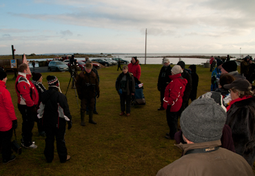 Ute på Vannebergaholmen delades gruppen snabbt i två läger, dels de som ivrigt började spana med sina tubkikare i alla riktningar efter sina favoritfåglar, dels de som ivrigt började gräva i ryggsäckarna efter den efterlängtade fikan. Så fort kaffedoften spred sig var det omöjligt att motstå även för de allra ivrigaste skådarna. Nåväl, underhand som tiden gick så vändes intresset åter mot fåglarna och vi kunde räkna in flera arter gäss och änder, bla sjungande ejder, några rovfåglar drog förbi, bla en blå kärrhök. Bland vadarna gladde som vanligt några skärfläckor, men kanske allra mest fyra kärrsnäppor som verkade känna sig hemma på holmen. En ensam gluttsnäppa lekte kurrragömma med oss och en silvertärna drog runt i viken.