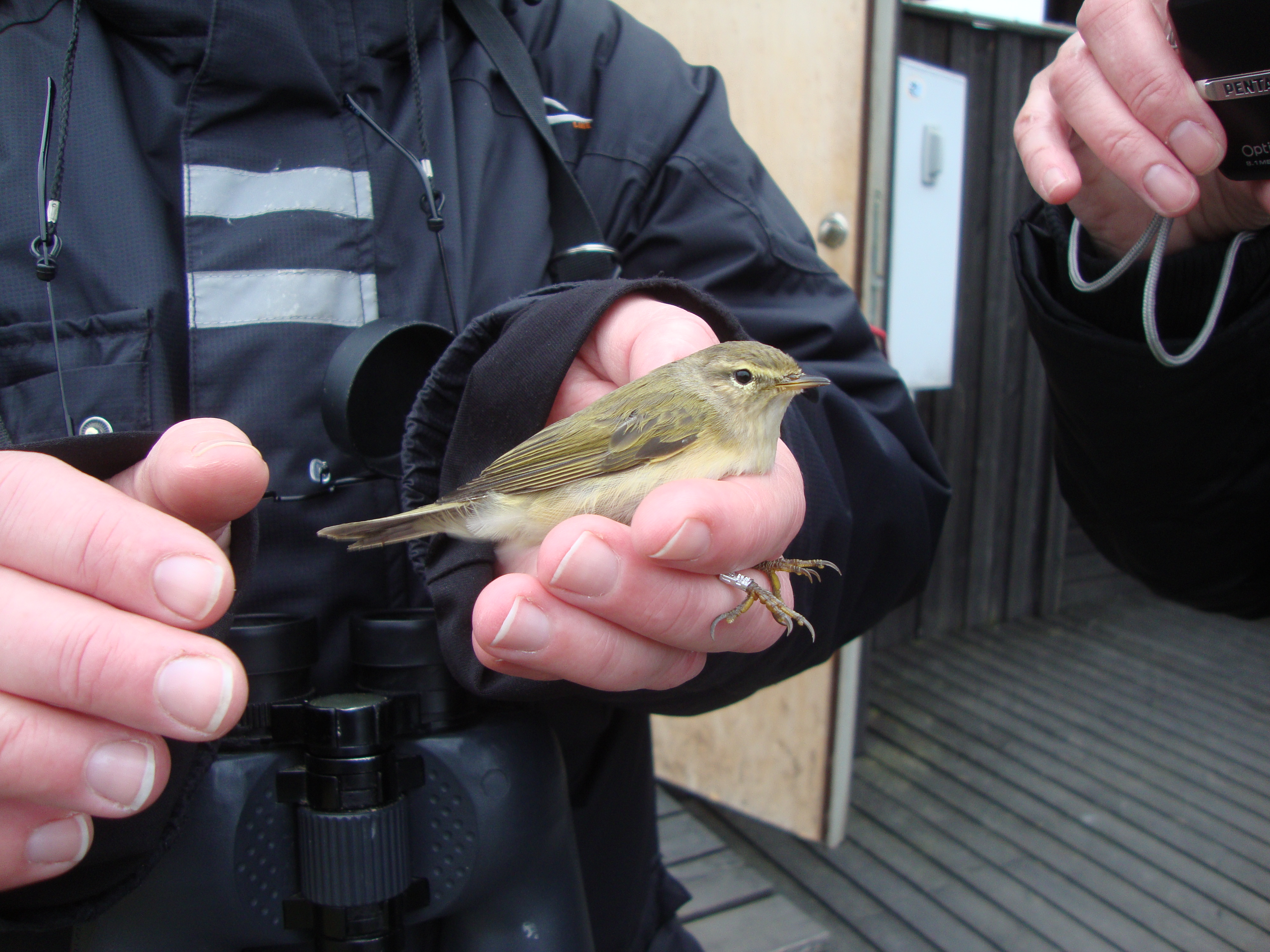 Efter intagen frukost har så verksamheten landat och vi går vår första nätrunda. Kungsfåglar och rödhakar, kungsfåglar och rödhakar… hela tiden medan vi plockar ner fåglar smackar nya i näten. Anders berättade under tiden lite kort om Fågelstationens historia och arbete. Vi bär in ”våra” fåglar till labbet där de märks, mäts och vägs. Vi blir visade lite olika karaktärer på näbb, handpennor och stjärtfjädrar för att åldersbestämma rödhakar. Kungsfåglarna könsbestäms genom färgen på ”kronan” där orange indikerar hanne. Övriga fåglar som vi fick titta närmare på var större hackspett, trädkrypare, taltrast, koltrast, gärdsmyg, gransångare och talgoxe. Totalt landade dagssumman på inte mindre än 634 fåglar!
