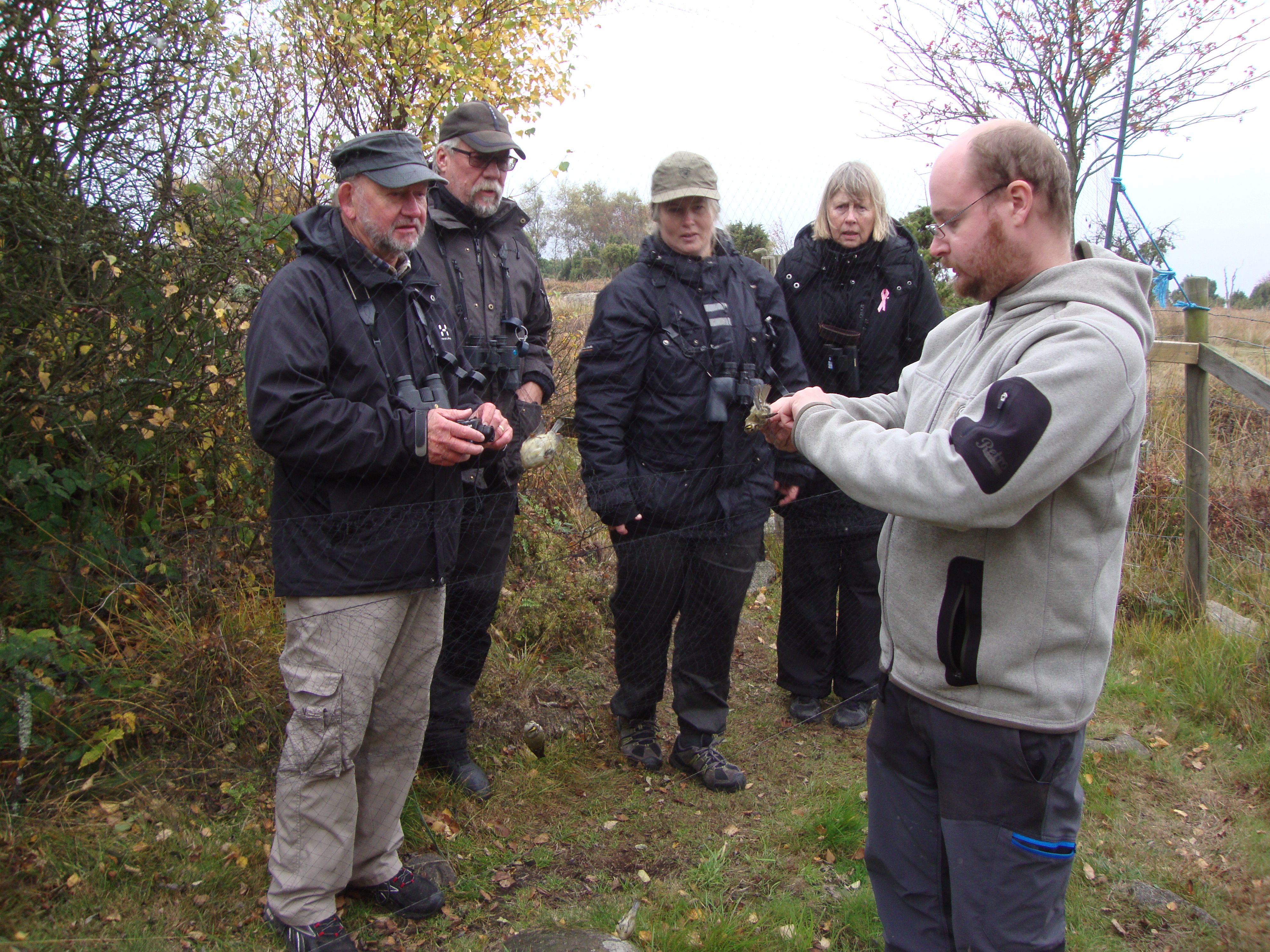 Väl framme stöter vi på 4 minst sagt sammanbitna ringmärkare. Anders och Christer märker kungsfåglar och rödhakar på löpande band när de övriga 2 drar ihop näten så att endast 4 nät är öppna. Med endast ringmärkning och utan vägning och mätning håller de två ett tempo på 6 fåglar i minuten. Vi bestämmer oss därför för att ”göra” udden en stund först.