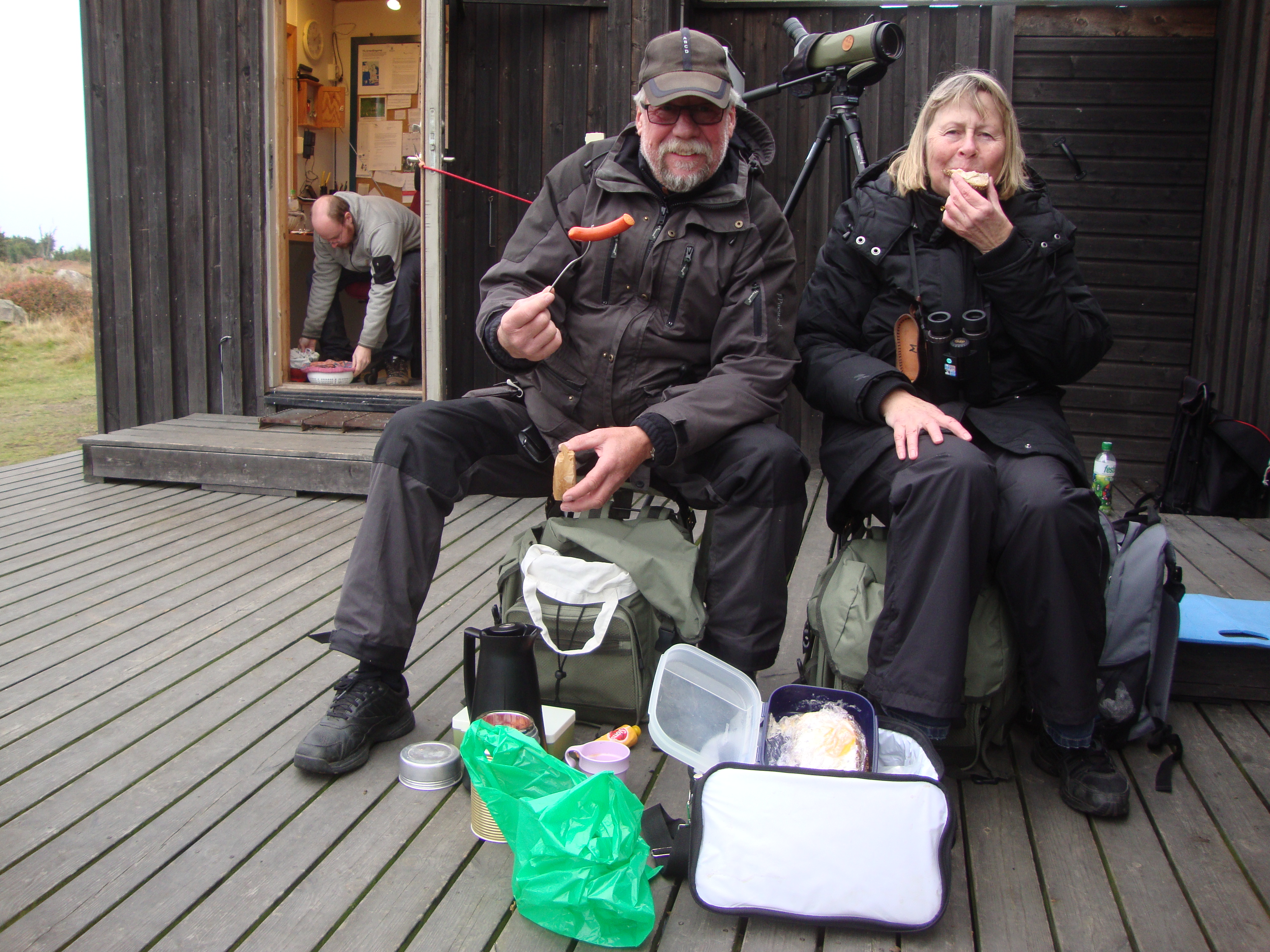 Alltnog, vad vore fågelskådning utan den obligatoriska fikan och de samtal som utspinner sig under ivrigt drickande och ätande av medhavda godsaker. Innan spaningen fortsatte gjordes en gemensam summering av vad vi hittills sett. Med ytterligare ett fåtal kompletteringar efter fikarasten, stannade dagens skörd på 47 arter. Återtåget skedde i något mer oordnad formering än vid exkursionens början. Somliga "gav upp" då fikat var slut, de mer ihärdiga dröjde sig kvar till 10-tiden.