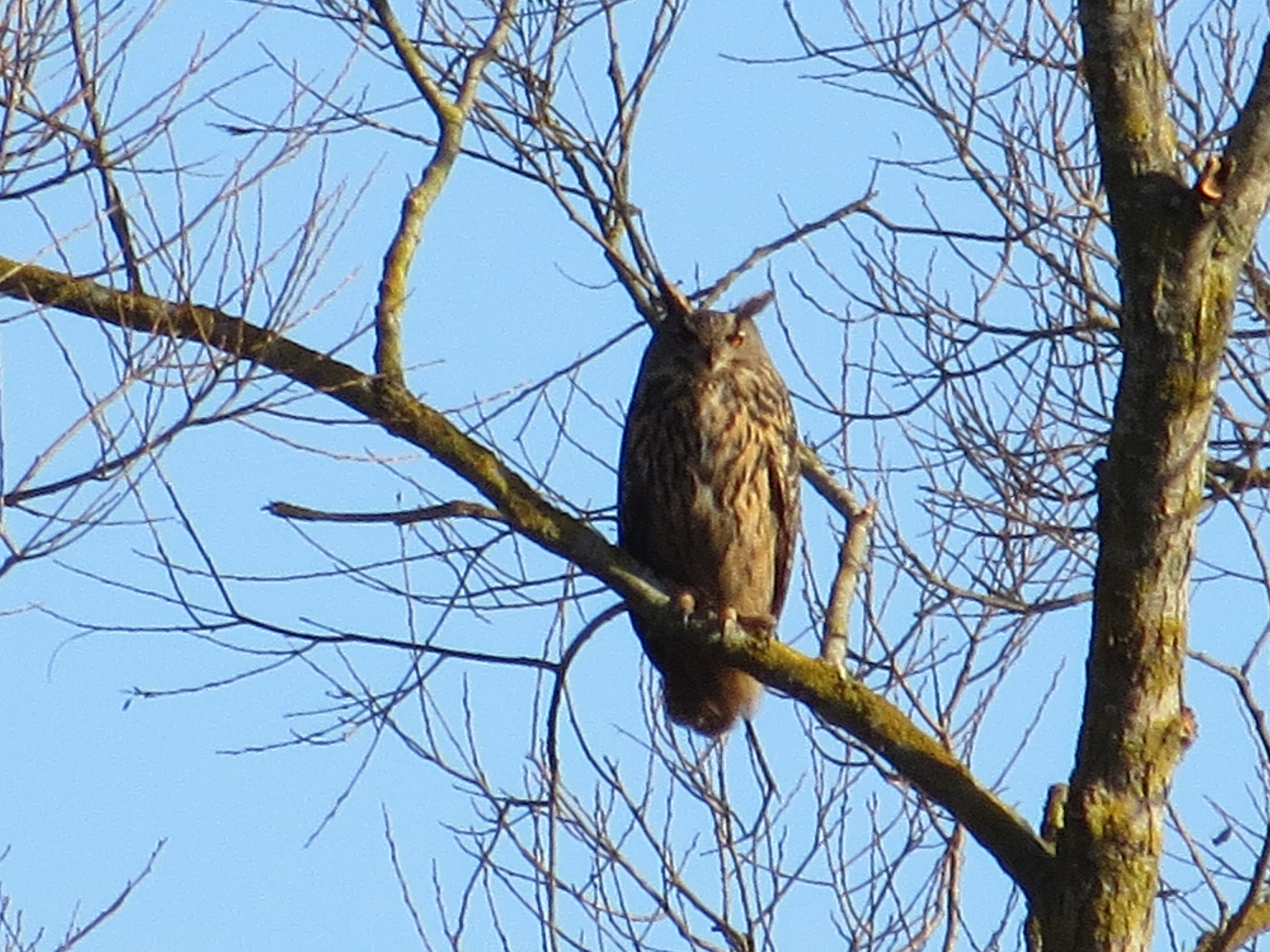 Och visst var det en uggla – en berguv faktiskt! Mitt på dagen! De brandgula ögonen under ett par kraftigt uppresta tofsar blängde mot fridstörarna borta på stigen. Men fågeln verkade uppenbarligen i övrigt inte särskilt berörd av den mänskliga kontakten. Det blev en del ”Oj!” ”Nä kolla!” och andra utrop – både milda och andra lite mer starka – som kom från den grupp, som inte ökat farten för att komma snabbare tillbaks till parkeringen vid naturum. Den här dagen hade det nog varit värt att skynda långsamt …