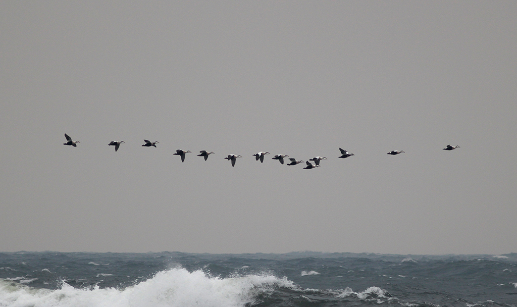 Bland de 20-talet arter som vi såg på väg mot söder kan nämnas prutgäss, drygt 1600 bläsänder, 45 stjärtänder, närmare 1400 ejdrar, 18 storlommar, en möjlig svartnäbbad islom på lite för långt håll för säker artbestämning, 1 gråhakedopping, ladusvalor, och givetvis en hel del måsar och trutar. 2 svarthakedoppingar, svärtor och sjöorrar skymtade i vågorna och 1 havsörn drog ut över havet på födosök.