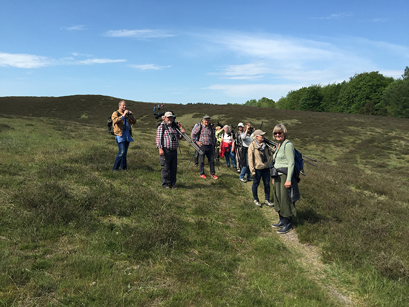 Molnen hade nu spruckit upp och resten av färden gick i stigande temperatur och strålande sol från blå himmel. Göken gol, en gammal havsörn flög förbi, en trana likaså och över heden sjöng trädlärkor och sånglärkor ikapp. Vi slog oss ned i en solig backe för dagens första fika. Hämplingar sjöng och gulsparvar matade ungar medan enbuskarna släppte sitt pollen i stora rökpuffar! Gröngölingen visade sig fint på en av ledningsstolparna och en gul och grann sommargyllinghane exponerade sig till mångas förtjusning helt kort i en död trädtopp!