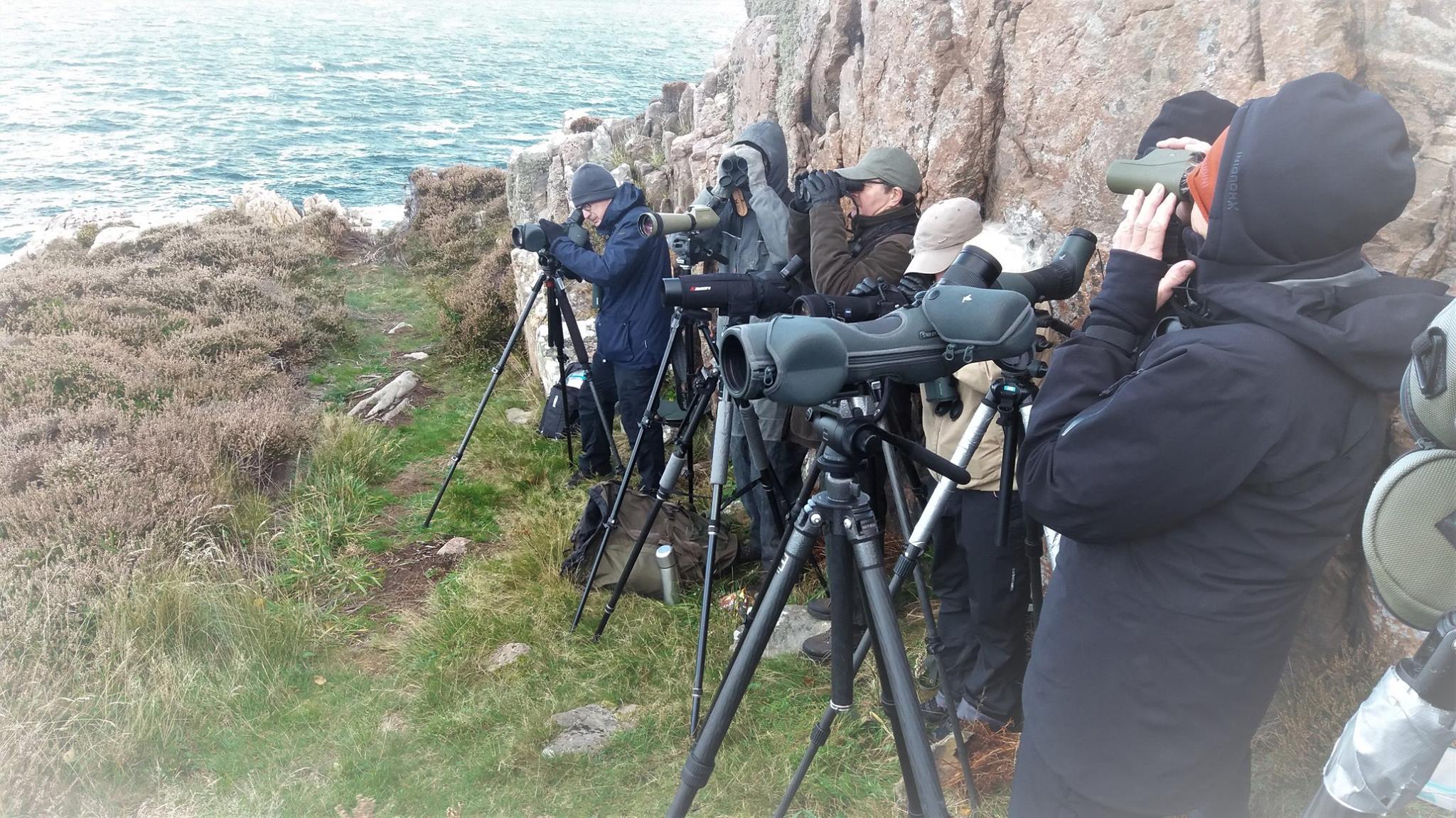 Bänken bestod här av en klippvägg, som vanligt ett nödvändigt skydd från vinden. Det var inte turen för lättklädda, utan rejäla lager av kläder och fika och ihärdig vilja att spana havsfågel med vindframpressade tårar i vägen. Visst, det var inte särskilt hård vind, men det räcker när man står utsatt mitt i havet. Vad får en människa att göra så mot sig själv egentligen? Vad är det som gör att jag uthärdar en hel dag havsskådning, men inte orkar fokusera på andra saker i mera än ett par timmar? Säkert dopamin. Säkert löftet om att allt kan hända och mycket plötsligt. Löftet om att tålamod lönar sig. Därute i fjärran bland vågorna, där har vi nog inte spanat så mycket. Nu är det ingen som ”jobbar” med att spana mot vänster, kanske jag får hitta något som flyger in i bilden just nu.