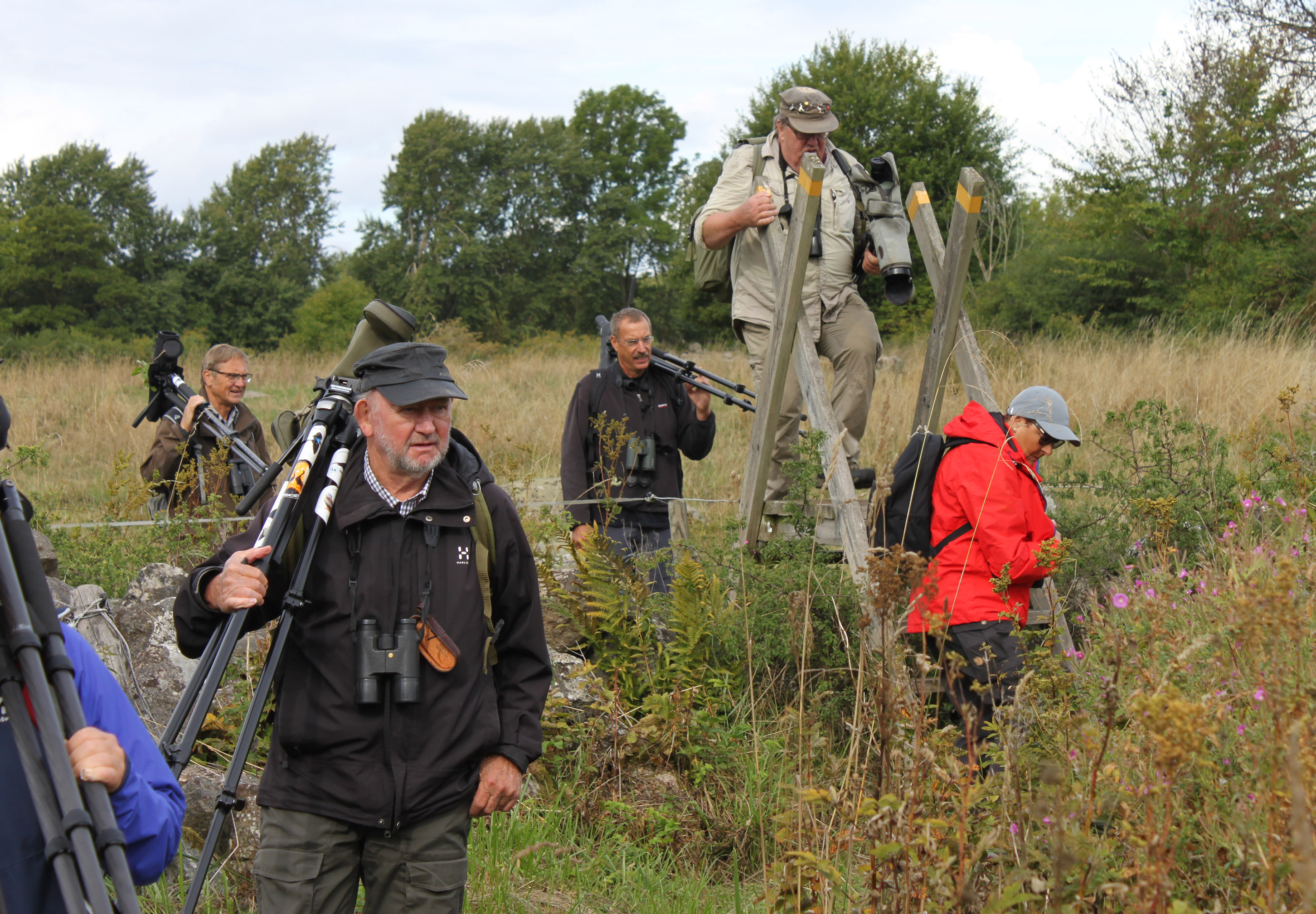 Det kändes, när 11 exkursionsdeltagare samlades denna morgon, att det rekordlånga högsommarvädret var till ända. Men det var kanske bra med svalare väderlek då Edenryds kustled innehåller ett otal övergångar på rangliga stegar och över nedrasade stengärdsgårdar. Så deltagarnas spänst sattes på vissa prov.