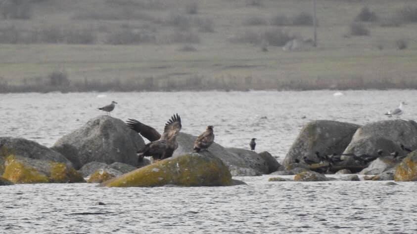 Antalet havsörnar är något knepigt att ange eftersom de var tämligen rörliga. Men bedömningen är mellan 10 och 15 olika individer. Eftersom det knappast rått någon vinter så här långt så var örnarna spridda över hela vårt område. De stora gåsflockarna drar till sig örnarna och några personer på väg ner mot hamnen noterade 5 stycken kring en slagen gås. Utöver stora rovfåglar bjöd dagen även på storspov och tofsvipa. Förmodligen övervintrare då dessa numera i låga antal är djärva nog att söka övervintra hos oss. Oftast numera med framgång.