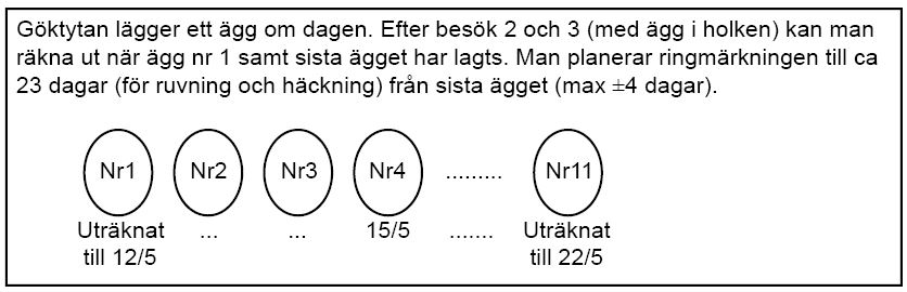 Besök nr 2 är lagom att göra en vecka senare. Tytan lägger 1 ägg dagligen innan kl. 05 på morgonen vilket innebär att ligger där då 4 ägg kan man räkna med att första ägget lades fyra dagar tidigare. Utifrån detta ger man göktytan en chans att lägga 15 ägg och detta datum blir då lagom för besök nr 3. Rekordet för en göktyta är 16 ägg men det vanligaste antalet är 11.